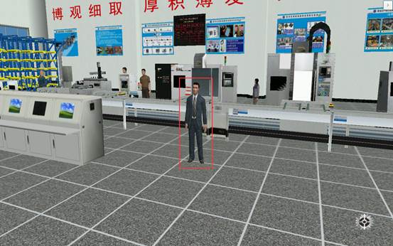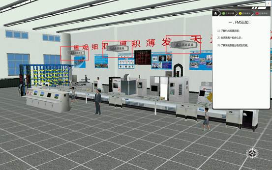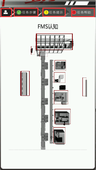 用户根据任务帮助依次点击各个设备,完成设备的认知任务,每完成一个设备的认知,任务帮助上的红框相应的消失,使用户能对整个FMS柔性制造系统有一个总体的认知。具体如图2-4所示。