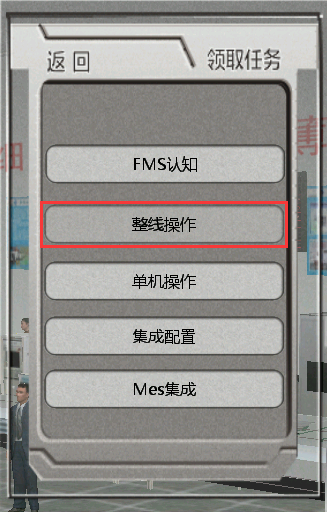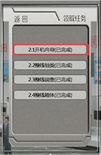 1、点击任务NPC,弹出任务界面,点击整线任务。整线任务有4个子任务模块,分为开机任务、整线轴类、整线端盖和整线箱体。其中除开机任务外,其余三个任务只需观看既定动画即可,不需要进一步的操作。具体如图2-7所示。
