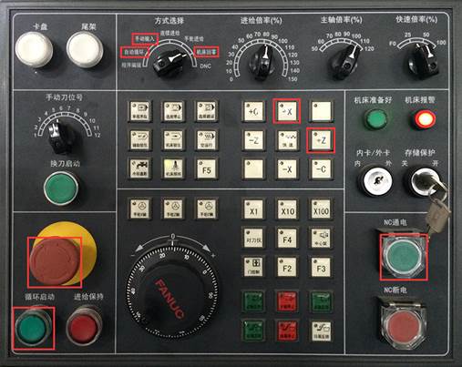 3、 点击机床回零按钮,在点击X+按钮,再点击Z+ 按钮,机床准备好灯亮。