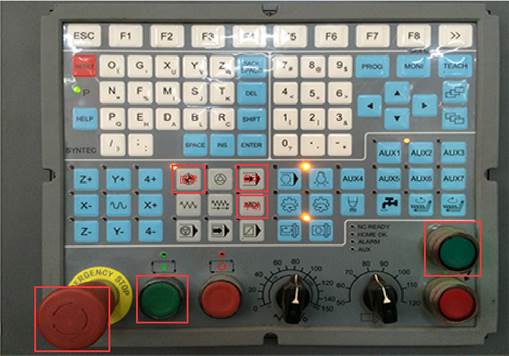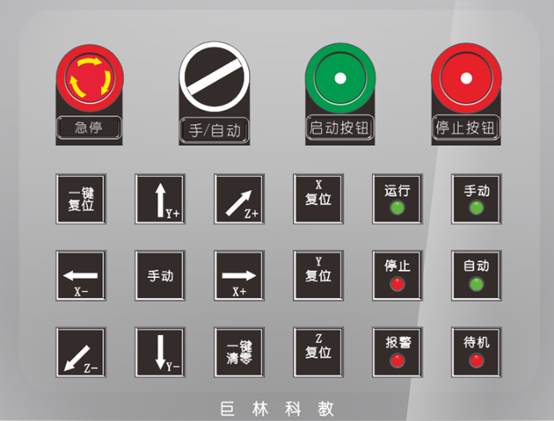 3、 点击加工中心中的回零旋钮,让加工中心进入回零模式,然后依次点击+Z、+Y、+X按钮,按钮依次亮起。