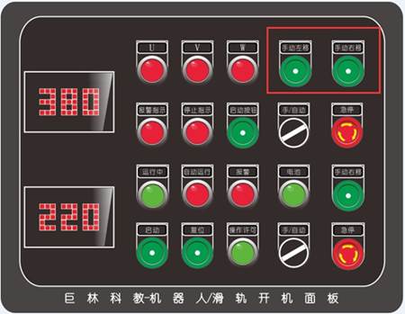 打开机器人开机界面,首先将手动、自动按钮打到手动模式,才可以进行后续的操作,右上角两个按钮手动左移、手动右移就是控制机器人滑轨的移动,按下按钮,机器人点动移动。