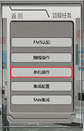 1、 接受单机任务后,用户可以打开场景设备模型上的面板,也可以从主菜单除打开单机菜单,跳出单机二级菜单界面,从而进行选择。具体如图2-34所示