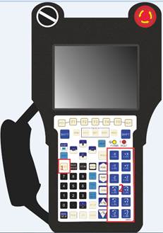 接受机器人单机任务后跳出机器人示教器。区域1为机器人复位按钮,按下按钮机器人回复安全位置。区域2为机器人6轴旋转按钮,按下按钮不放即可进行相应的旋转,弹起按钮即可停止旋转。