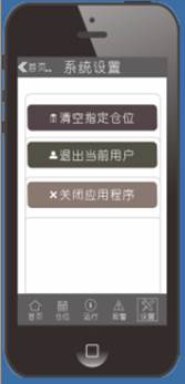 用户在系统设置界面可以做以下操作,清空指定仓位、退出当前用户和关闭应用程序。其中清空指定仓位顾名思义,清空某个你所指定的仓位,使该仓位中无物品;退出当前用户就是退出到手机登录界面,用户可以更改用户名和密码,再次登录;用户点击关闭应用程序则直接退出手机界面。